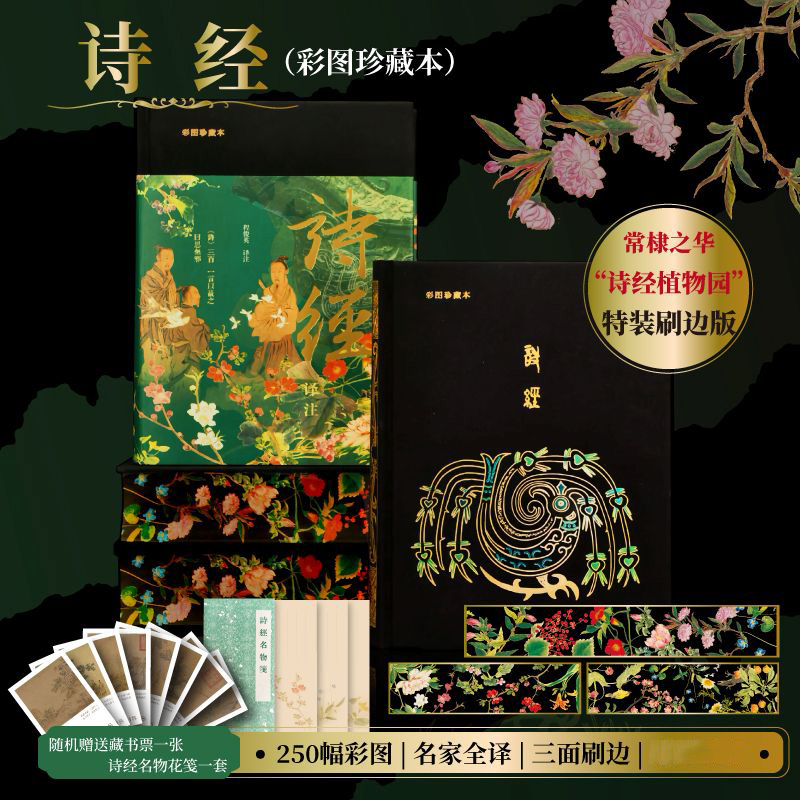 《詩經譯註》是由程俊英教授編著的全譯本。也是許淵沖先生《詩經》英譯本的首選底本。本書為《詩經譯註》彩圖特裝典藏版,採用“煙霞絨”布面精裝,以三色彩燙工藝呈現西周時期的“垂冠鳳鳥紋”,書名“詩經”集自國寶級文物虢季子白盤銘文,書脊採用雲雷紋及鳳鳥紋燙金裝飾,環襯為「鳥身回首龍首神」紋樣,護封融合《詩經》中的鳥獸草木、商末周初的父乙觥等歷代圖像及文物元素,生動展現《詩經》文化的源遠流長與藝術嬗變。全書包括原文、譯文、註釋、前言、題解、注音、彩圖、圖釋、地圖。原詩、譯文、註釋「三位一體」的版式,頗便閱讀。內文收錄《詩經》動植物圖、南宋馬和之《詩經圖》及諸侯國地理位置圖共250餘幅彩圖,配以2萬餘字圖釋,其中包括《詩經名物圖解》中未見的30餘幅彩圖,讀者可大飽眼福。另有14幅精美《詩經》地理位置示意圖,詳析諸侯國背景及古今地理關係。程俊英先生筆下的《詩經》白話譯詩清麗雋永,詩味濃鬱,具有女學者獨有的浪漫韻味,不論是十五國風中家喻戶曉的詩句,還是二雅三頌中語言艱澀的詩篇,通新世實英先生富有節奏的白話詩翻譯,西周閔神的真實生活與新世界的真實事物。隨書附贈喜馬拉雅獨家全書誦讀